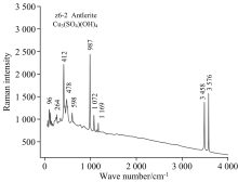 拉曼光谱因其准确性和无损性符合对文物样品检测的需求。 z-4, z-5, z6-1, z6-2各样品拉曼光谱检测结果见图3— 图6, 通过分析确定了样品z4的红色颜料为朱砂, 样品z5的黄色颜料为雌黄, 样品z6中黑色颜料为碳黑, 绿色颜料为块铜矾。 样品z6的绿色颜料不是常见的铜碳酸盐, 如孔雀石。 有关颜料的文献中, 总结有五、 六种铜硫酸盐, 其中曾应用于绘画艺术品的主要是块铜矾[antlerite, CuSO4· 2Cu(OH)2]、 水胆矾[brochantite, CuSO4· 3Cu(OH)2]、 蓝铜矾[langite, CuSO4· 3Cu(OH)2· 2H2O]、 一水蓝铜矾[posnjakite, CuSO4· 3Cu(OH)2· H2O]等, 这些矿物主要形成于火山、 热液及化学风化环境中。 在欧洲, 这些绿色含铜矿物颜料曾被发现用于壁画[1]、 手稿[2, 3]及架上画等。 国内通过对绘画样品的分析也表明, 孔雀石[4]并不是唯一用作绿色颜料的铜矿, 水胆矾[5]、 氯铜矿[6]与其他矿物的混合物也曾被发现。 但用块铜矾代替孔雀石或铜绿作绿色颜料的情况不常见。 就矿物来源而言, 这种自然矿床在国内相当罕见。 从矿物降解机理的角度分析, 块铜矾可能是硫酸铜转化而来[7], 或是作为孔雀石的转化产物[8]。 绿色铜硫酸盐通常是暴露在污染环境中铜制品的降解产物, 同时也作颜料, 但在给定的相对湿度、 污染物(SO2/SO3)和生物活性(影响pH值和酸的类型)条件下, 铜硫酸盐可以转化为更稳定的晶型, 如块铜矾、 蓝铜矾或一水蓝铜矾。 也有分析认为, 在硫酸钙的存在下, 可能因受过量的生物活性的影响(地衣和其他排泄草酸的微生物), 孔雀石[Cu2CO3(OH)2]可以转化为碱性硫酸铜, 如水胆矾、 块铜矾和一水蓝铜矾。