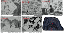 样品的扫描电镜图如图1所示, 根据结核内部纹层和连续性可以将结核划分为7个分层[图1(f)]: 核心层1412-1-1由大量铁锰微结核组成, 铁锰微结核呈现低反射率纹层结构, 微结核之间充填了沉积物; 1412-1-2分层由连续条带状铁锰氧化物组成, 铁锰氧化物呈现高/低反射率柱状/树枝状结构; 1412-1-3和1412-1-4由不连续铁锰氧化物组成, 铁锰氧化物呈现高/低反射率柱状/树枝状结构; 1412-1-5和1412-1-6分层呈现高/低反射率柱状/树枝/致密状交替结构; 1412-1-7呈现低反射率柱状、 纹层结构。