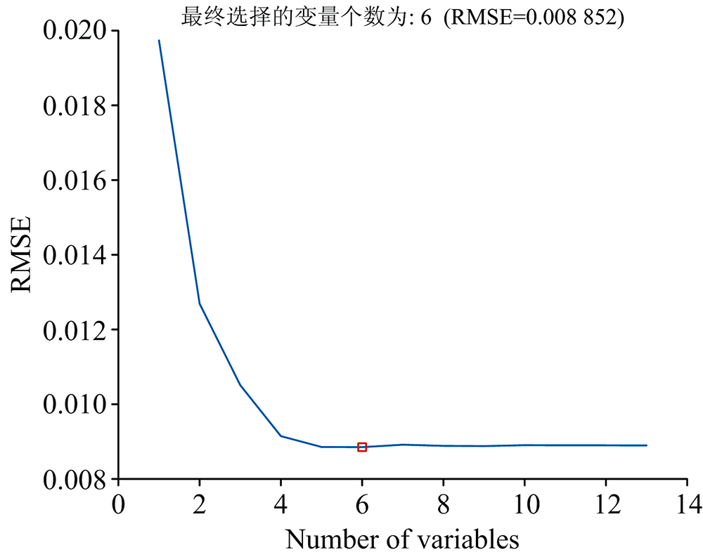 使用SPA算法对经过SiPLS选择的273个光谱变量进行特征波长选择, 进一步降低光谱数据的维度。 设置SPA的变量选择为1到20, 变量的选择过程如图4所示, 从图中可以发现RMSE的值是随被选择的波长数的变化而变化的, 当被选择波长数大于6时, 此时的RMSE的值趋于平稳, 变化不再显著, 此时的RMSE的值为0.008 852。 考虑到被选择波长数越少越能减少模型的运算量和复杂度, 因此最终选择的最优变量数为6。