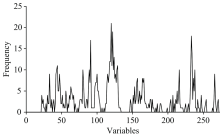 GA的控制参数设置为: 初始种群数为100, 变异概率0.01, 遗传迭代次数为100和变异概率0.5。 图3为GA迭代100次所选光谱变量的频率, 一共筛选出32个特征光谱变量。