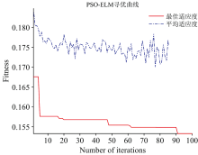 式(5)和式(6)中: c1和c2为学习因子; r1和r2为0到1的随机数; w为惯性因子; v为粒子速度; X为粒子位置。 (3)将最优适应度更改为Pb和Gb, 然后当迭代次数达到最大值或适应度达到设定值时停止寻优, 把粒子群算法得到的最优初始权值和隐含层阈值代入ELM中, 实现对模型稳定性和精度优化的目的。