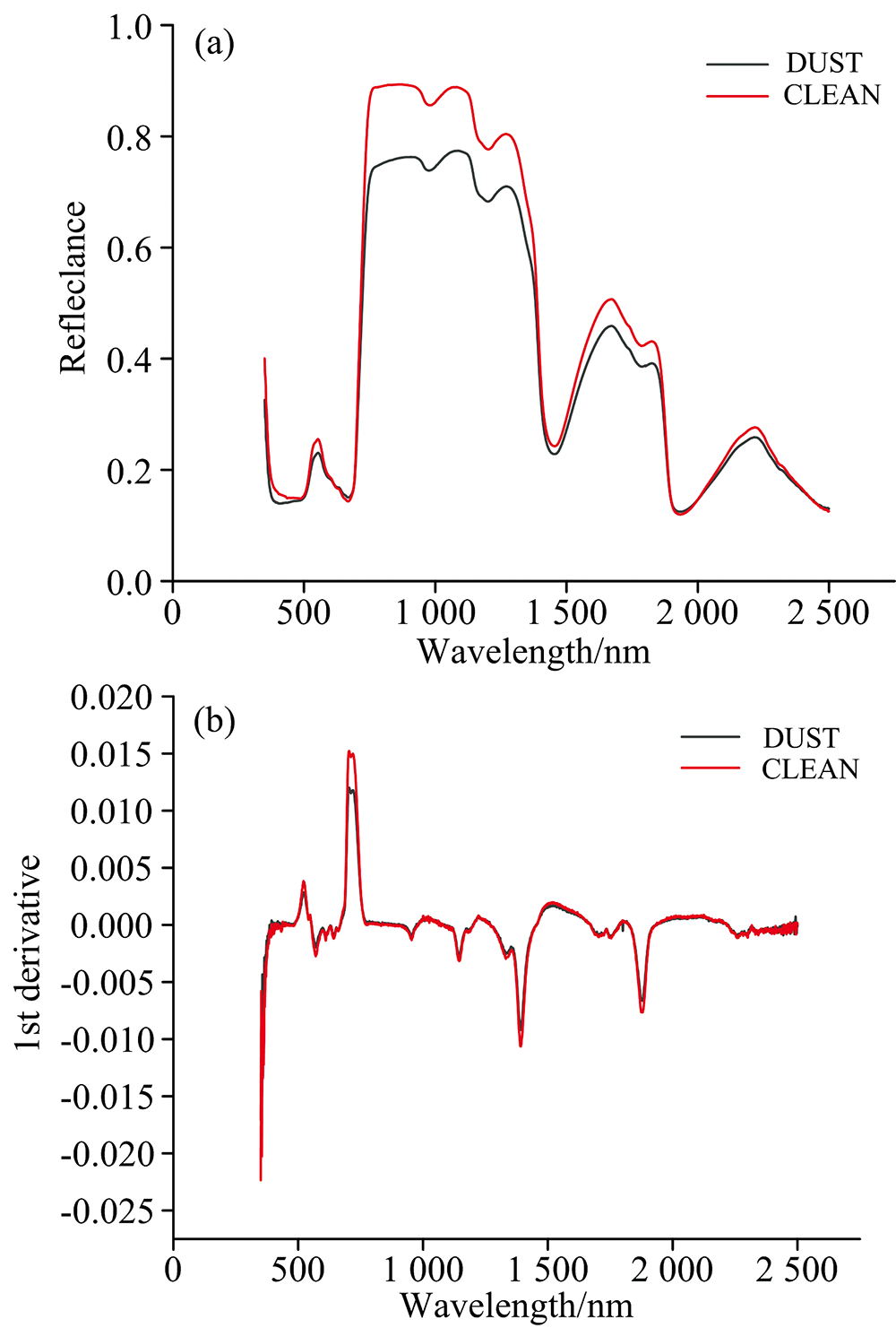 | 图4 滞尘对光谱特征的影响(a)和除尘前后经一阶导数过处理的光谱曲线(b)Fig.4 Effect of dust retention on spectral characteristics (a) and spectral curve (b) after first derivative over treatment before and after dust removal |