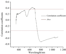 计算50个叶片光谱反射率比值(除尘前/除尘后)和对应叶面滞尘量的相关度, 结果如图5所示。 由图5可知, 光谱反射率比值和滞尘量在354~705 nm波段为正相关, 最大正相关系数位于653 nm波段, 其值为0.420, 在510~590 nm处明显凹形, 该波段位于绿光波段内, 表明绿光波段对尘埃的敏感性低于其他波段。 706~1 110 nm波段为负相关, 最大负相关系数位于801 nm波段, 其值为-0.729。 由相关性曲线分析可知, 红波段和近红波段对滞尘高度敏感。