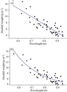 | 图5 滞尘量与光谱反射率比值(除尘前后)之间的关系Fig.5 Relationship between dust retention and spectral reflectance ratio (before and after dust removal) |