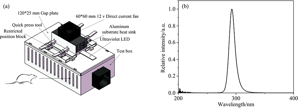 The peak wavelength of the UV LED is 293 nm. Because of studies have shown that in all spectra, 290~300 nm UV wavelengths are most effective for vitamin D production in the equivalent model of human skin or human skin[25-26. The LED irradiation array was constructed according to the experimental desired irradiation area (30 cm2) for the experimental rats. The aluminum substrate was used to dissipate heat, a rapid pressing tool and a defined position block were installed for fixing, the upper seal and the 120 mm× 25 mm gap pressure plate were installed, and the exhaust fans were installed at both ends to keep the temperature constant [Figure 1(a)]. The reflectance of the box was 1.3, and the power density of the UV radiation was 0.8 mW· cm-2, delivered for a duration of 1 000 s, twice a week, for a total of 12 weeks. The energy density was selected according to the rats' minimum sub erythema dose for rats. The irradiation parameters was are listed in Table 1. The LED irradiation group received the UV LED irradiation treatment, while the sham operation group did not. After 12 weeks of irradiation, the rats in all groups were euthanized, and samples (right femur, liver and skin) were harvested.