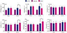Serum TRAP is secreted by osteoclasts and is often used as a bone resorption marker. Serum PTH is an important hormone that regulates calcium and phosphorus metabolism in the human body. PTH levels are often observed when the bone resorption rate increases[30]. As shown in Fig.4(a, b), serum PTH and serum TRAP levels decreased significantly following UV irradiation in the LED irradiation group compared to the unirradiated OVX group (p< 0.05). No significant changes were observed in the Sham group's serum PTH and serum TRAP levels before and after the experiment. Phosphorus and calcium are basic substances of bone mineralization and participates in the whole process of bone remodeling. As shown in Figure 4(c) and (f), no significant differences were observed in serum phosphorus and serum calcium between the LED irradiation group, Sham group and OVX group. Serum bone ALP and serum P1NP are markers reflecting bone formation and osteoblast activity[31]. As shown in Figure 4(d) and (e), the serum bone ALP and serum P1NP levels in the LED irradiation group were significantly higher than those of the unirradiated OVX group (p< 0.05). There were no significant changes in serum bone ALP and serum P1NP levels between the OVX group and the Sham group before and after the experiment.