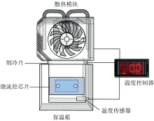 首先设计制作了一个制冷系统, 用于对微流控芯片中的液态水进行制冷处理。 该制冷系统由制冷片、 散热模块、 温度传感器、 保温箱和温度控制器构成, 所设计的制冷系统如图3所示。 保温箱的主要材料是泡沫, 而泡沫材料对太赫兹波的透过率几乎达到百分之百, 在实验中不会造成太赫兹波的损耗。 制冷片的工作状态由温度控制器控制, 制冷片的导热面在均匀涂抹了导热硅脂后与散热模块相连, 在制冷过程中制冷片导热面的热量会通过散热模块扩散到空气中; 制冷片的制冷面被密封在保温箱内, 在制冷过程中会对保温箱内部环境进行制冷。 温度传感器连接着温度控制器, 将温度传感器放置在保温箱内, 可以实时监测保温箱内部环境的温度并显示在温度控制器的屏幕上。 在实验过程中, 先往微流控芯片注满水, 然后将其固定在保温箱内。 制冷片会持续给保温箱内部环境进行制冷, 同时, 微流控芯片中的水的温度也会随环境温度的下降而下降。 当温度传感器检测到的温度达到目标制冷温度时, 温度控制器会控制制冷片停止制冷; 当温度高于目标温度时, 温度控制器会控制制冷片再次制冷, 从而达到保温箱的环境温度恒定的目的, 该制冷系统的温度控制精度为0.1 ℃。