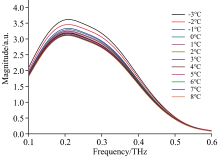 将注满水的微流控芯片固定在保温箱内, 然后把保温箱置于光路中, 调节保温箱的位置使得太赫兹波能透过微流控芯片中的水。 利用制冷系统对保温箱内部环境进行制冷, 温度的变化范围为8~-3 ℃, 每隔1 ℃进行一次太赫兹透射测量。 所测得的不同温度下水的时域谱如图4所示; 将测得的样品信号进行傅里叶变换得到频谱图, 如图5所示; 最终得到的不同温度下水的太赫兹透过率谱图, 如图6所示。