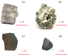 自然铜[图1(a)]为黄铁矿, 多呈规则的立方体形态, 直径大多约1~2 cm, 表面具平行条纹, 浅铜黄色, 局部棕褐色, 条痕黑绿色, 强金属光泽, 无解理, 参差状断口, 摩氏硬度约6~6.5, 质地硬但性脆。 蛇含石[图1(b)]为黄铁矿, 结核状, 表面粗糙, 凹凸不平, 表面黄白色, 断面铜黄色, 条痕绿黑色, 金属光泽, 无解理, 断口可见放射状或同心层, 摩氏硬度略大于2.5, 质地坚硬不易碎。 代赭石[图1(c)]为块状, 颜色棕红色至暗棕红色, 条痕为樱桃红色, 半金属-土状光泽, 无解理, 摩氏硬度5~6。 磁石[图1(d)]为不规则块状, 具参差状断口, 表面铁黑色或者棕褐色, 条痕黑色, 具弱金属光泽, 表面参差不齐, 多带有杂质, 无解理, 摩氏硬度5.5~6, 脆性较大, 磁性较强, 具吸铁能力。