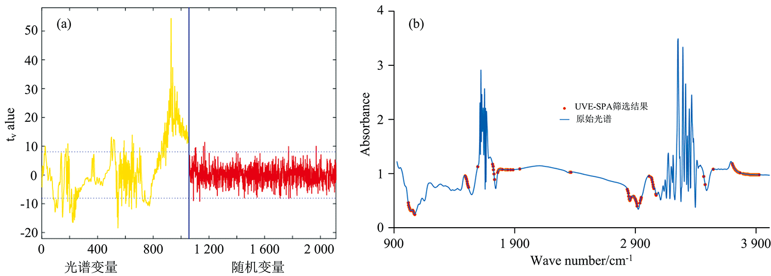 基于MC-UVE算法的特征波长变量选择结果如图2所示, 图2(a)中分界线左侧为测量光谱变量矩阵, 右侧为算法添加与测量光谱变量数相同的随机噪声矩阵, 根据随机噪声最大阈值决定光谱矩阵中的无用变量, 并将其剔除。 由于MC-UVE方法根据随机噪声选取阈值, 因此筛选得到的变量较多, 如图2(b)所示, 达到142个。
