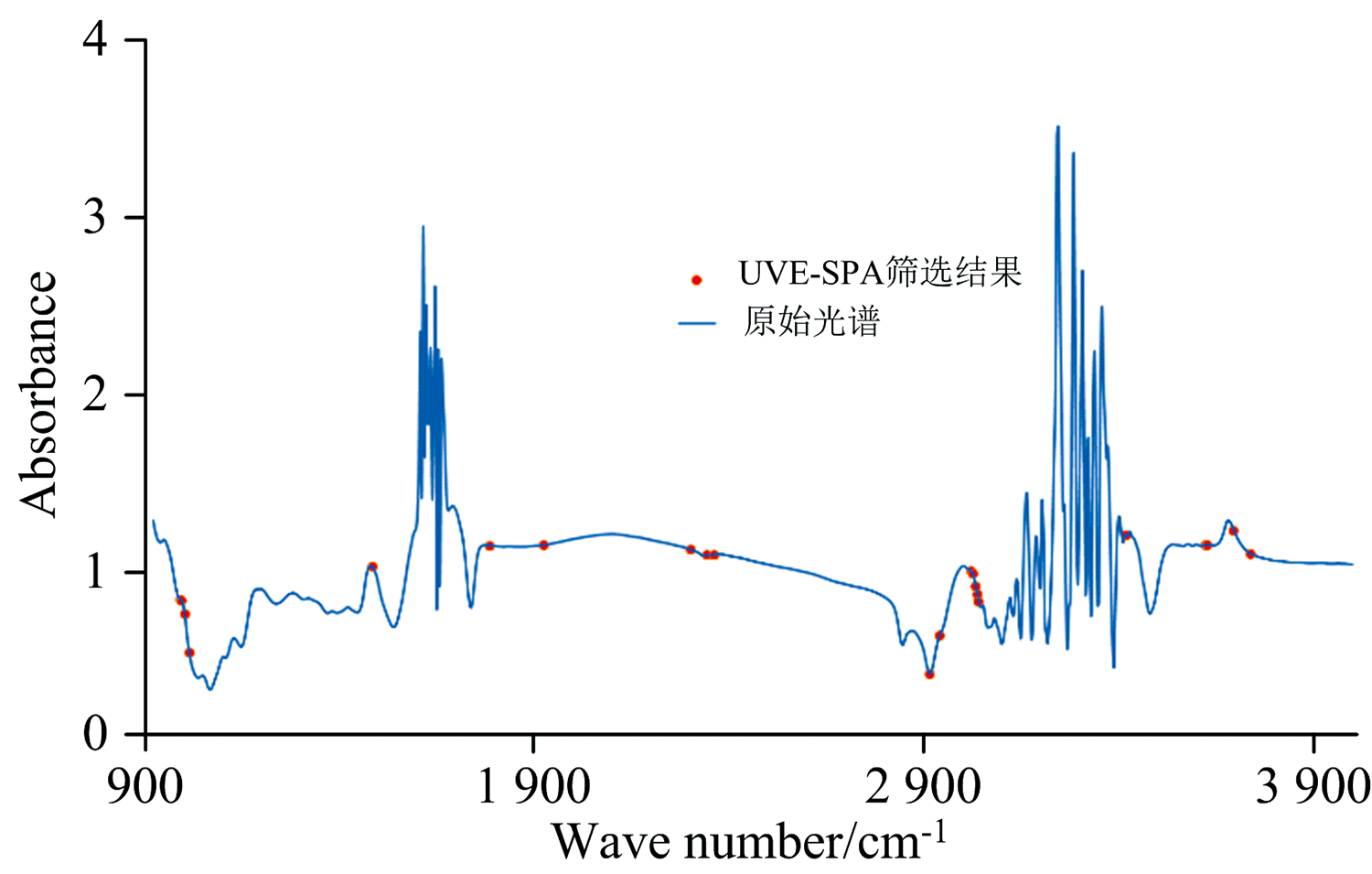 图3中, 在MC-UVE方法基础上, 进一步采用SPA方法进行二次筛选, 最终得到变量数量为26个。 从筛选得到的变量分布可以看出, 大部分波长变量分布在不同物质吸收峰。 变量数目减少, 一方面可以避免分类模型训练出现过拟合, 另一方面也可以提高模型分类识别效率。