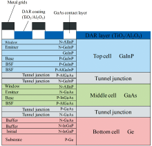 实验中使用了尺寸为10 mm× 10 mm, 厚度约为175 μ m, 转换效率高达28.3%的三结GaInP/GaAs/Ge太阳电池。 该电池采用双层减反射膜(double anti-reflection coating, DAR)TiO2/Al2O3, 以Ge为衬底, 由三个N/P结构的子电