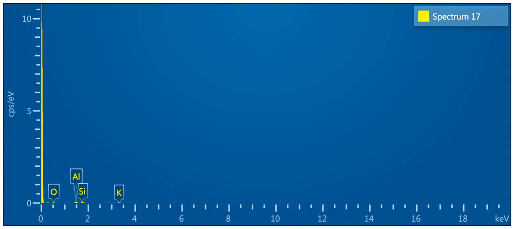 熊家冢墓地出土费昂斯珠主体由大量纯净石英砂构成, 扫描电镜图可见图9, 大部分石英颗粒保持几十个微米级别大小, 颗粒棱角磨圆度较好。 费昂斯珠表面可见有机物、 未烧结的石英砂颗粒、 烧结的釉层和隙间玻璃相, 除石英外还可见钾长石、 钠长石等矿物颗粒。 能谱定性测试共161个点位, 从测试结果中看到熊家冢墓地出土费昂斯珠中除含不定形C外, 绝大多数晶质矿物颗粒为石英(SiO2)(见图10, 表2); 部分颗粒测出含K、 Al、 Si、 O元素, 推测为钾长石; Al、 Si、 O为铝硅酸盐矿物(见图11, 表3); Cu、 Si、 O为釉层CuSiO3· H2O(见图12, 表4); Na、 Al、 Si、 O元素, 推测为钠长石; 此外还测出少量Ca、 Ti、 Fe、 Mo、 B、 Mg、 Sr、 Cl、 Br等元素。 因测试表面颗粒的成分, 故大多测试点位含Cu元素。