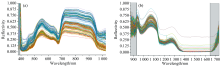 图2(a, b)展示了斜生四链藻在生长周期内不同时间获得的200个样本的VIS(a)和NIR(b)平均光谱。 由于光谱首尾存在噪声(图中阴影部分), 因此截取VIS区392~1 023 nm 共500个波段和NIRS区931.40~1 645.82 nm共213个波段, 作为光谱建模波段。 VIS/NIRS光谱主要反映含氢基团(如C— H、 O— H、 N— H等)振动的倍频与合频吸收, 可通过光谱数据处理及建模分析获取样本中丰富的结构和组成信息。 例如, 属于色素吸收波段的430和680 nm以及属于水分子吸收波段的980 nm处有明显的反射波谷[5]; 1 159 nm 附近的反射波谷则与O— H、 C— H有关[9]; 位于1 490~1 600 nm归属于N— H吸收谱带[10], 也出现反射率降低。