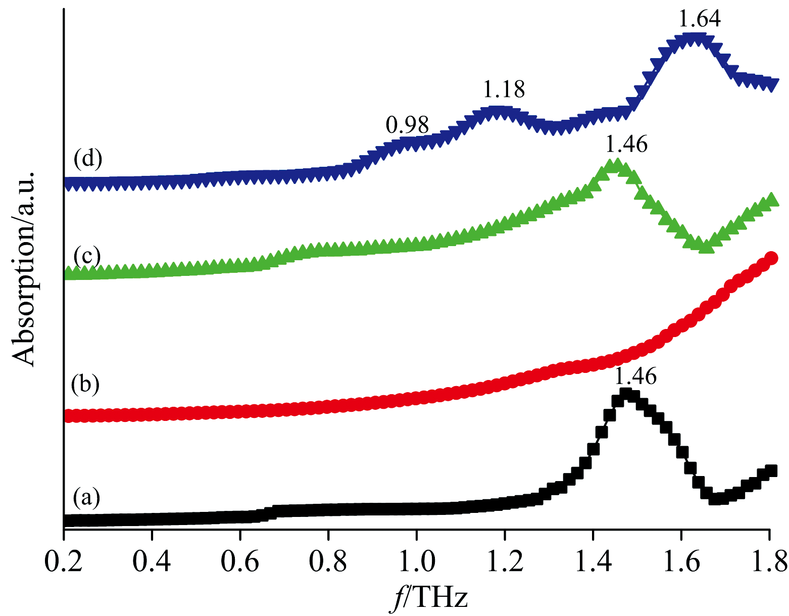 | 图5 IA(a)、 GA(b)、 物理混合物(c)和IA-GA共晶(d)的THz吸收光谱Fig.5 THz absorption spectra of IA (a), GA (b), physical mixture (c) and IA-GA cocrystal (d) |
