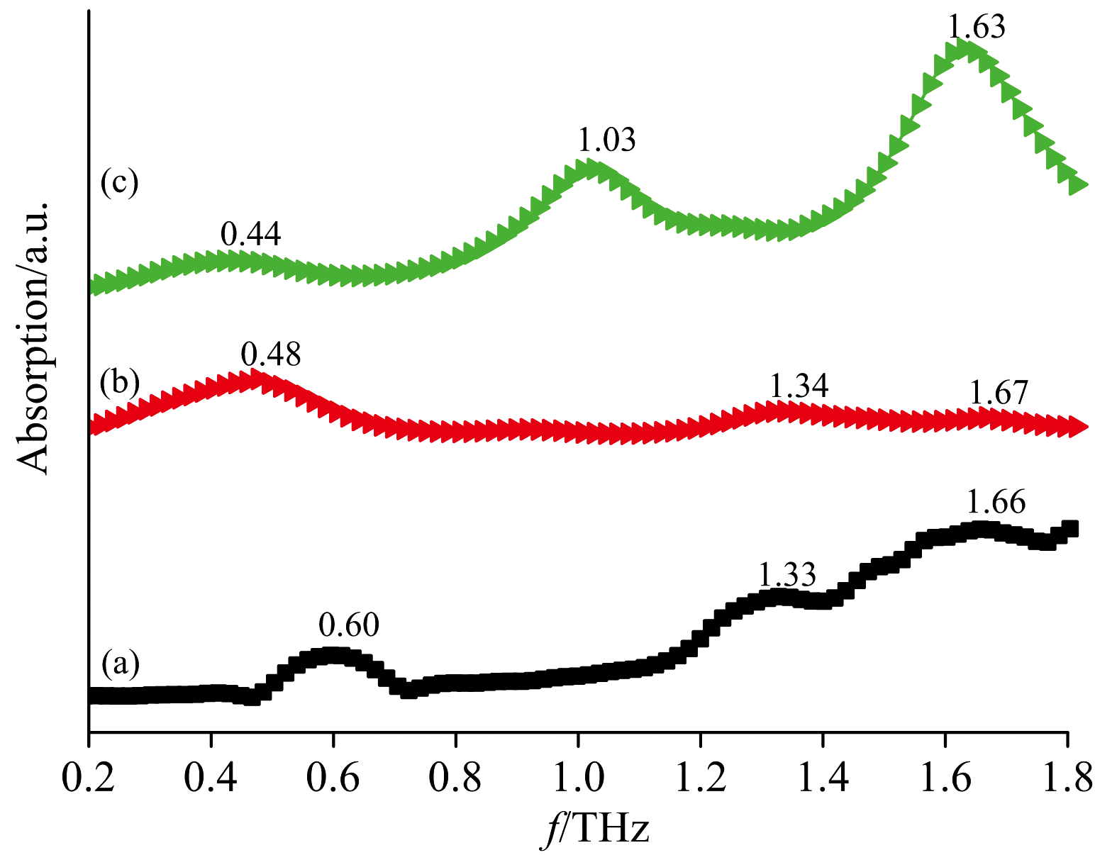 | 图8 比较实验IA-GA共晶(a)、 理论共晶形式Ⅰ (b)和形式Ⅱ (c)的THz吸收光谱Fig.8 Comparisons of THz absorption spectra of experimental IA-GA cocrystal (a), theoretical cocrystal form Ⅰ (b) and form Ⅱ (c) |