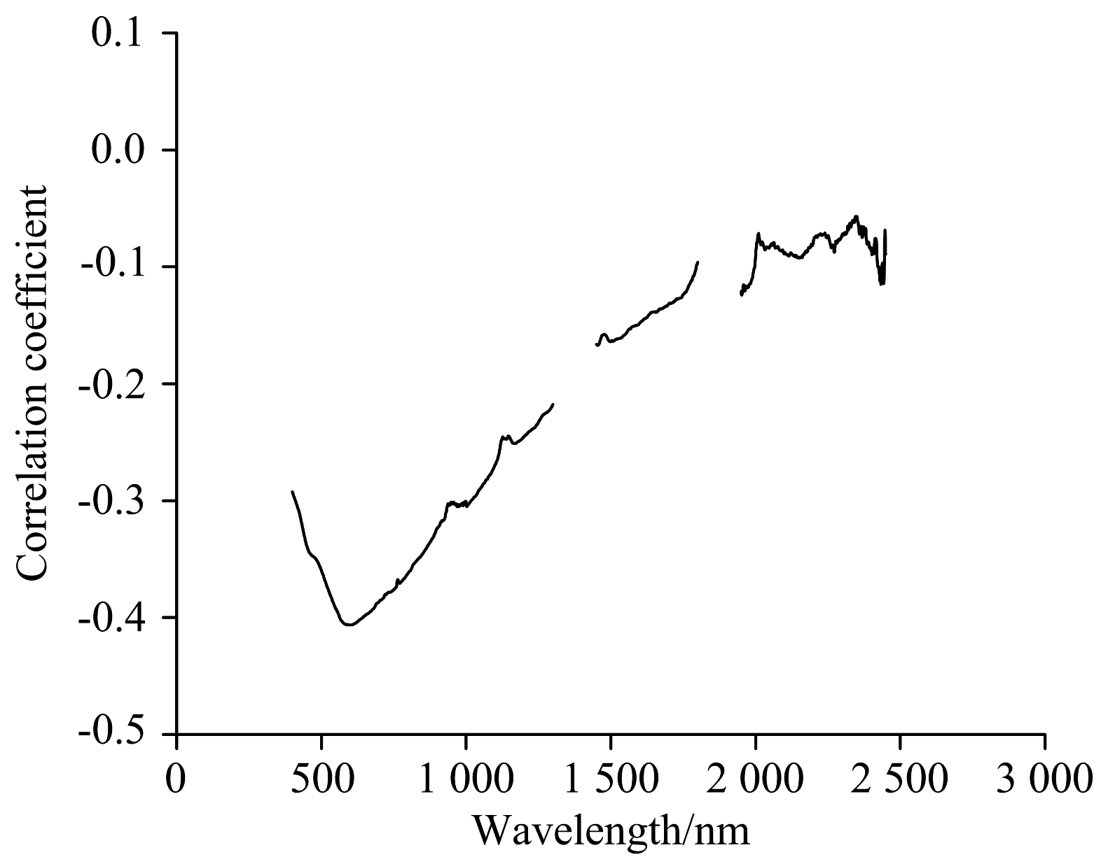 由图3相关分析的结果可知, 土壤有机碳含量与土壤光谱反射率R存在明显的负相关关系, 相关系数范围绝对值|0.005|< r< |0.406|; 相关曲线在400~1 800 nm区间较为平滑, 在1 950~2 450 nm区间呈现波动变化; 相关系数在400~616 nm呈现增加趋势; 相关系数在616~1 300和1 451~1 800 nm呈现降低趋势; 578~616 nm波段内相关性整体最强, 相关系数最大值r=|0.406|; 相关系数平均值r=|0.208|。