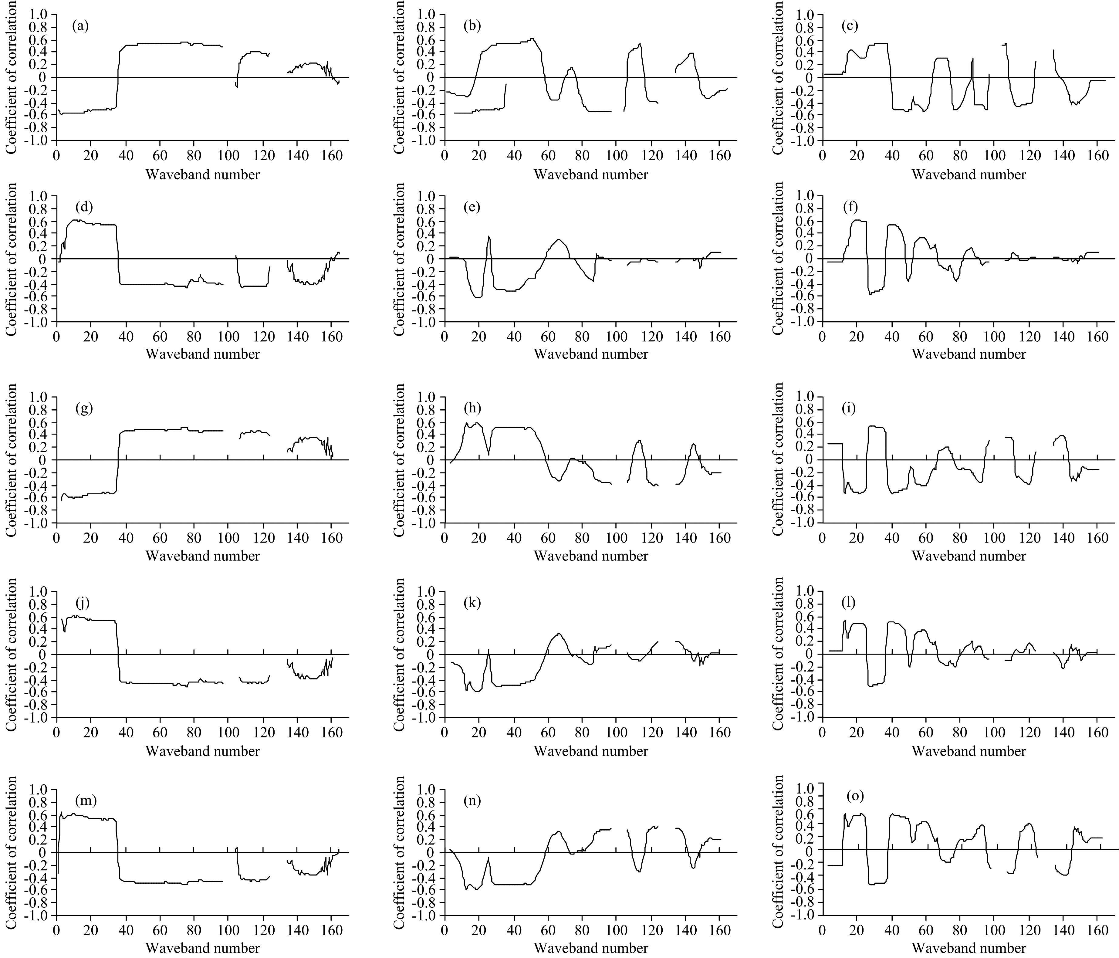 将红树林的原始光谱以及15种光谱变换之后的值与红树林野外样方实测的地上生物量值进行相关分析, 如图3和表3所示, 从图中可以看出红树林原始光谱曲线与地上生物量实测值在40波段之前呈现出负相关关系, 40波段之后则呈现出正相关关系。 而15种变换之后的红树林高光谱曲线与原始的红树林地上生物量的相关系数相比原始的光谱反射率的相关系数有所提升, 说明红树林高光谱数据经过光谱变换之后, 在某种程度上提高了原始光谱的信噪比, 可以在红树林冠层尺度上提供更为有效的关于植被生理和生化等方面的信息。 为了对红树林生物量进行更好的反演以提高模型预测的精度, 我们将显著性水平为0.01的显著相关波段筛选出来作为红树林地上生物量反演的特征波段。