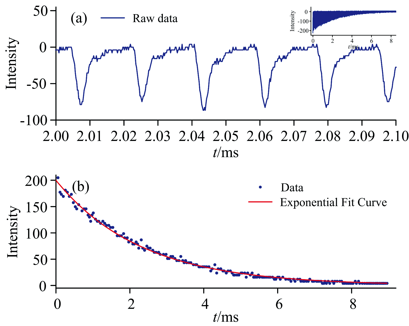 When the optical cavity is empty, the signal of the ring-down cavity is shown in the upper right corner of Fig.7(a). In Fig.7(a), the round-trip propagation time of the optical pulse in the cavity is 18 ns, which is larger than the laser pulse width of 10 ns, and the interference of two adjacent pulses in the cavity can be effectively avoided. As shown in Fig.7(b), the ring-down time τ 0 of the empty cavity is 2.33 μ s by selecting the maximum value of the ring-down signal and e-index fitting.