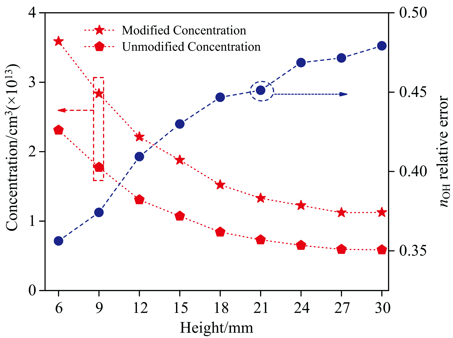 The overlap factor η is 2.188 cm and B12 is 2.278× 109 m2· J-1· s-1, which can be obtained by checking the LIFBASE database. Then the OH concentration will be obtained by substituting the above parameters into Eq. (5). As shown in Fig.9, the OH concentration at different height positions is obtained by accurate measurement of experimental parameters in the combustion environment of case 1. The OH concentration increases by 35.6%~47.9% compared with the uncorrected one.