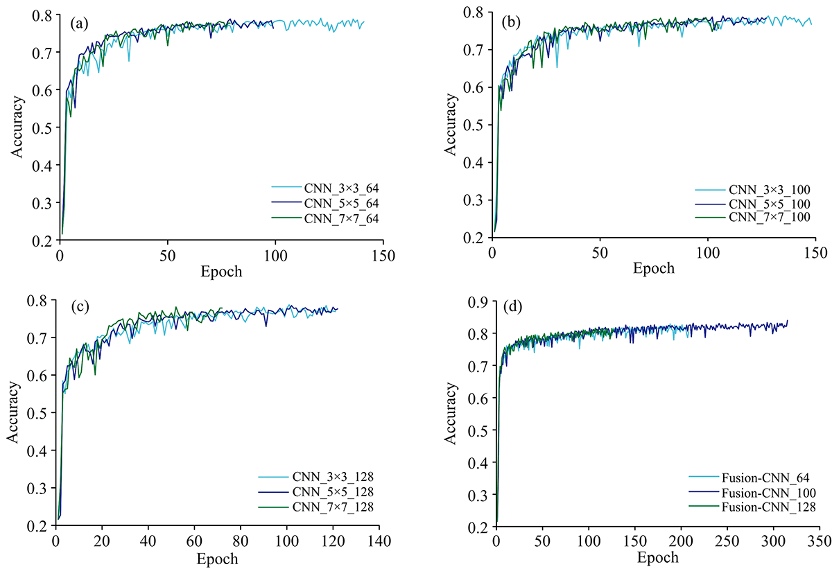 | 图4 验证集数据的分类准确率曲线 (a): CNN_64; (b): CNN_100; (c): CNN_128; (d): Fusion-CNNFig.4 Classification accuracy curves of validation set data (a): CNN_64; (b): CNN_100; (c): CNN_128; (d): Fusion-CNN |