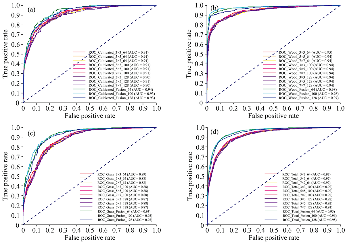 根据图5可知, 所有模型的ROC曲线都位于y=x直线的上方, 因此, 所有模型的分类性能都优于随机猜测策略的分类结果。 单卷积核的CNN模型中, 小尺寸的卷积核模型CNN_3×3_64的ROC曲线更靠近左上角的(0, 1)坐标点, 模型AUC值更高, 证明小卷积尺寸的CNN模型分类性能更优。 相比CNN, 多卷积核融合的Fusion-CNN模型的ROC曲线更接近左上角的(0, 1)坐标点。 Fusion-CNN模型的AUC值均高于CNN模型的AUC值, 其中图5(b)林地ROC曲线中的Fusion-CNN_100模型的AUC值达到了0.98, 模型对林地的分类效果非常接近最佳分类模型。 从图5(d)总体AUC值来看, Fusion-CNN_100模型的AUC值最高, 达到了0.96, 模型分类性能最优。