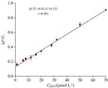 在最佳实验条件下, 测定不同DPA浓度时体系的荧光强度, 以DPA浓度C为横坐标, 荧光恢复率(Δ F/F1)为纵坐标, 绘制标准曲线。 如图6所示, 在1.15~70.0 μ mol· L-1浓度范围内, 荧光恢复率(Δ F/F1)与DPA浓度呈正相关, 线性方程为Δ F/F1=0.011c+0.131, 相关系数r=0.991。 根据公式LOD=3Sb/k计算出该方法的检出限为0.34 μ mol· L-1。 为评价该方法的精密度, 选取8.0、 16.0和40.0 μ mol· L-1三个浓度分别平行测定7次, 计算得到相对标准偏差(RSD)分别为0.65%、 2.42%、 4.19%。