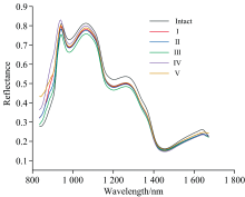 图1所示为完整枣与瘀伤枣的平均光谱曲线, 在800~1 000 nm波段范围内, 完整枣与瘀伤枣的光谱曲线有明显重叠; 在1 000~1 700 nm波段范围内, 完整枣原始光谱曲线明显高于瘀伤枣光谱曲线, 但对于不同瘀伤等级长枣的光谱曲线无法区分。 完整枣与瘀伤枣的平均光谱曲线整体呈先高后低的趋势, 其中在980、 1 200和1 450 nm左右的光谱区域均存在吸收带, 近红外区域的吸收带通常反映不同化合物中分子键的振动[13]。 980 nm左右的吸收带由O— H基团的第二泛音引起, 1 450 nm左右的吸收带与O— H基团的第一泛音和蛋白质中N— H基团的第一泛音吸收有关, 1 200 nm左右的吸收带反映的是与碳水化合物相关的C— H基团的第二泛音[14]。