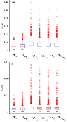 表4统计了测试样本NCS和Munsell的原始光谱和恢复光谱之间的平均均方根误差(mean RMSE)和最大均方根误差(max RMSE)。 图7表示测试样本NCS和Munsell的原始光谱和恢复光谱之间的均方根误差(RMSE)分布的箱形图(boxplot); 从表4和图7可以看出, 测试样本为NCS或Munsell时, 主成分分析法的光谱精度(RMSE)优于本文推荐的方法和其他4种权重主成分。 结合色度精度结论, 权重主成分的色度精度提高是以牺牲一定的光谱精度为代价。 但是, 色度精度提高对于光谱颜色复制有重要的现实意义。