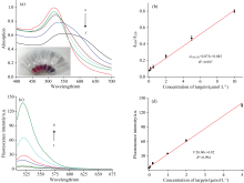 在最合适pH和浓度条件下, 分别改变目标物, 罗丹明110与金纳米作用时间, 测试溶液的吸光度和荧光强度的变化, 如图4(c)所示。 结果表明, 目标物与金纳米作用时间为60 min; 罗丹明110与金纳米作用时间30 min的情况下, 吸光度和荧光强度达到最佳。