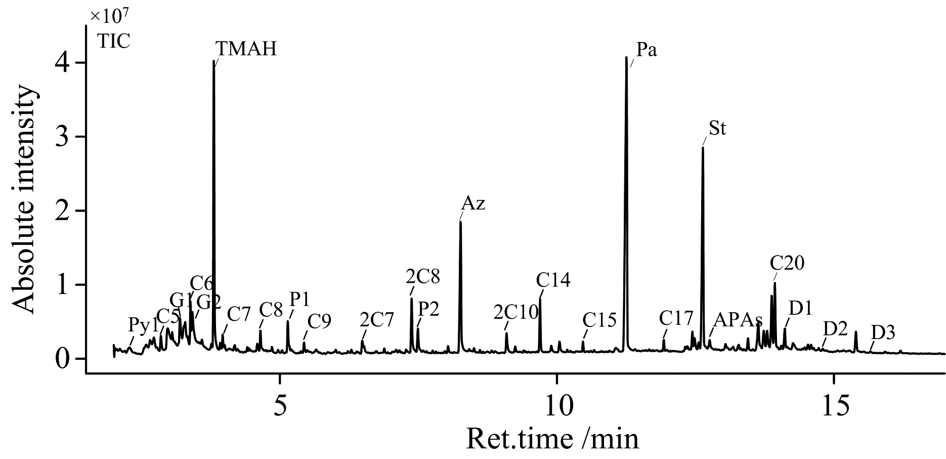 Py-GC-MS在分析有机材料方面有着突出优势, 其分析快速、 灵敏度极高的特点使其在文物分析领域的应用逐渐增多, 且日趋成熟。 利用甲基化试剂(TMAH)对油类样品进行前处理, 可以降低其极性, 增大裂解后碎片的分离度, 提高分析的精准性。 壁画样品经THM-Py-GC-MS分析后的总离子色谱(TIC)如图6所示。