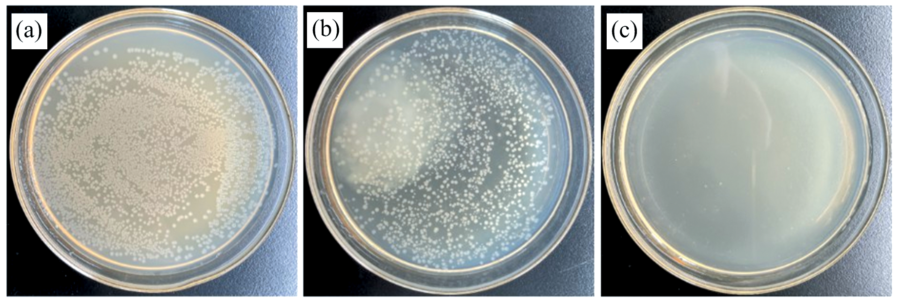 磷光分子在水中猝灭时产生的单重态氧具有使细胞消亡的功效。 研究了BFCzB作为光敏剂进行光动力抗菌化疗。 大肠杆菌分别在光照下培养, 有、 无光照下与BFCzB水溶液共培养1 h。 如图5(a— c)所示, 大肠杆菌在光照环境下可以正常生长, 在培养基中可以观察到大量菌落。 在黑暗环境下填充BFCzB基质的培养基中, 大肠杆菌菌落的生长仍然良好, 说明BFCzB分子本身对大肠杆菌在黑暗环境下的生长没有不利影响。 光环境下, 由于BFCzB在水中猝灭时产生的1O2的杀菌作用, 填充BFCzB基质的培养基中几乎看不到大肠杆菌菌落[如图5(c)]。