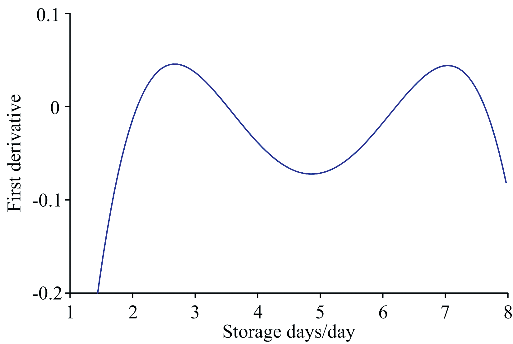 对黄瓜叶绿素含量进行5阶多项式拟合, 结果如图7所示, 拟合度R2为0.997 7, 说明拟合效果极佳。 从图7可以看出, 贮藏前两天, 叶绿素含量下降, 第3到第4天略微上升, 第5天又迅速降低, 第6到第8天微微上升, 总体呈下降趋势。 图8为叶绿素多项式拟合曲线的一阶导数, 贮藏1~8天之中共有3个拐点, 第1个拐点大约在第3个贮藏日, 对应一阶导数值为正值; 第2个拐点在第5个贮藏日, 对应一阶导数值为负值; 第3个拐点在第7个贮藏日对应一阶导数值为正值。 一阶导数为正表示原函数呈上升趋势, 一阶导数为负则相反。 拐点是曲线凹弧与凸弧的分界点, 也就是原函数曲线方向向上和向下趋势改变的点。 结合图7, 第5个贮藏日黄瓜的叶绿素含量迅速下降, 说明黄瓜品质在第5个贮藏日迅速变劣。