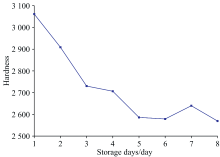图6为黄瓜贮藏过程中硬度变化曲线, 分析图6可知, 贮藏前5天, 黄瓜硬度下降迅速, 而第5天之后黄瓜软化速度变慢, 说明黄瓜已经不再新鲜, 逐渐丧失商品价值, 第5天就是黄瓜质量转变的节点。 通过图6中黄瓜硬度变化曲线发现, 贮藏第5天之后硬度变化呈波动趋势, 但整体是慢下降, 贮藏第7天黄瓜硬度值高于前两天, 这可能是由于每次测试的随机取样和黄瓜软化速度变慢造成的。
