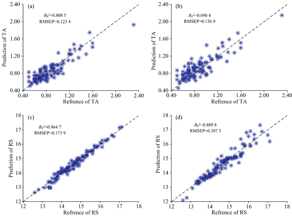 | 图7 最优模型对新样本预测结果 (a): TA预测结果; (b): RS预测结果Fig.7 Prediction result of optimal models for new samples (a): Prediction results of TA; (b): Prediction results of RS |