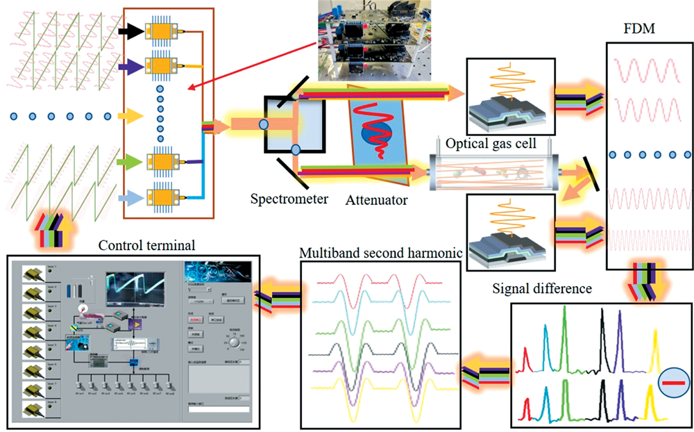 图3为混气识别以及光学与电学的选频同步, 多路激光光谱信号经过带通滤波分离出某一激光波段的检测信号, 再经过差分锁相放大成二次谐波信号导入到SVM分类算法模型。 识别出气体种类并进行光谱波段频率的选择, 根据气体二次谐波峰峰值确定检测浓度; 电学选频, 每个激光器驱动电路板分别使用不同频率的正弦波作载波信号, 根据不同载波频以带通滤波实现频分多路复用, 实现光谱选频与电选频的同步, 初步实现多组分气体的定性识别与成分分析。