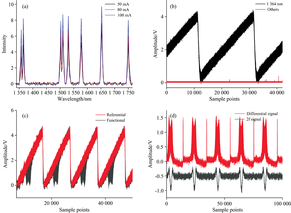 为了将多路不同载波频的激光信号分离提取, 需通过不同载波频为中心频率的带通滤波器来滤除其他载波频的光谱信号。 图2为系统抗干扰测试与激光器的信号测试, 图2(a)为八路激光波段直接测试, 可以在1 350~1 750 nm波段明显观察到八种激光器分别在50、 80和100 mA驱动电流下的工作。 图2(b)为1 364 nm波段搭载3 kHz正弦波经过带通滤波的测试情况。 图2(c)为1 653 nm波段近红外检测CH4的两路信号, 图2(d)为1 653 nm近红外两路信号的差分和二次谐波信号。 可分析出系统经过带通滤波有很好的抗干扰性。 被测气体在对应近红外波段可以观测到明显吸收峰, 差分信号和二次谐波信号也能很好地提取出来便于分析。
