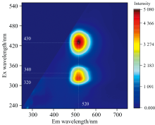 三维荧光光谱测试使用的是日本JASCO的FP-8500型荧光光谱仪。 光源为150 W氙灯, 激发光谱的范围为230~550 nm, 发射光谱的范围是250~750 nm, 激发带宽5 nm, 发射带宽2.5 nm, 反应时间0.5 sec, 电压600 V, 扫描速度1 000 nm· min-1, 激发数据间隔2 nm, 发射数据间隔1 nm。