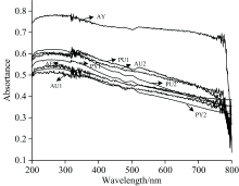 开垦和未开垦土壤的不同土层中HA和HU紫外-可见漫反射光谱形状相似, 吸光度值随着波长的增加呈下降趋势。 由于HS的组成复杂, 多种官能团互相干扰, HA和HU紫外-可见漫反射光谱无明显特征峰, 吸光度值大表明其包含的吸光基团较多。 PY2的HA吸光度值最大, AU1吸光度值最小, 表明PY2包含的吸光有机成分最多, AU1包含的吸光有机成分最少(图1)。 AY的HU吸光度值最大, 其余研究对象的吸光度相对较小, 说明AY包含的吸光有机成分最多(图2)。 各研究对象HA吸光度值大于HU吸光度值, 说明HA包含的吸光有机成分较多, 化学组成较为复杂。