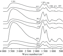 开垦和未开垦土壤不同土层中HA具有相似的红外光谱, 但是一些主要吸收峰的强度在不同的研究对象之间具有明显的差异, 表明HA的分子结构和官能团数量不同(图3)。 3 386 cm-1表示酚、 乙醇和有机酸中— OH伸缩振动, 说明形成了以H键相连的多聚体, 主要来自于碳水化合物、 蛋白质或氨基酸[12, 13, 14]。 2 917和2 849 cm-1是脂肪族成分的伸缩振动, 其中2 917 cm-1为C— H伸缩振动, 2 849 cm-1是— CH2伸缩振动[15], 主要来自细胞膜和细胞壁等组织成分。 1 714 cm-1表征羧基和羰基官能团的C=O伸缩振动[16], 1 598 cm-1表征— COO伸缩振动[17], 1 378 cm-1表征脂族C— H变形振动[2], 1 044 cm-1是糖或脂族C— O伸缩振动, 主要来自于植物和微生物残体中的碳水化合物[4]。 PU2和AEL在吸收峰3 386、 2 917、 2 849、 1 714、 1 598和1 378 cm-1处的振幅较大, 说明PU2和AEL所包含的酚类化合物、 含羟基化合物、 脂肪族化合物、 羧酸、 以及含羰基的醛、 酮和醚等化合物的含量较多(表5)。 HU的红外吸收峰中3 391 cm-1表征— OH伸缩振动、 1 583 cm-1表征— COOH伸缩振动、 1 396 cm-1表征脂族C— H变形振动、 1 046 cm-1峰为糖或脂族C— O伸缩振动(图4)。 各研究对象HU的红外光谱具有相似的特征, 但各主要吸收峰的吸收强度不同。 AEL和PU1在吸收峰3 391、 1 583、 1 396和1 046 cm-1处振幅较大, 说明AEL和PU1的HU中包含的酚类化合物、 羧酸、 脂肪族和糖类化合物含量较多(表5)。 开垦和未开垦土壤不同土层HA和HU的红外光谱各吸收峰强度的比较分析表明(表5和表6), 开垦因素对黑土和灰土的影响不同, 开垦后黑土HA和HU的酚类化合物、 含羟基化合物和脂肪族化合物等含量增加, 而开垦后灰土HA和HU的酚类化合物、 含羟基化合物和脂肪族化合物含量下降, 原因可能是黑土成土条件和过程相对复杂, 土壤有机碳分解缓慢不易流失, 而且外界开垦因素在一定程度上增加了土壤有机质含量, 而开垦因素促进灰土土壤有机质的分解, 这在一定程度上与元素分析的结果基本相符。