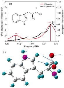 对于色氨酸, 其实验光谱及理论计算结果如图6(a)所示。 实验测得色氨酸在0.5~1.5 THz波段呈现一处明显吸收峰, 位于1.4 THz处; 而计算结果显示, 色氨酸在相同波段内呈现两处吸收峰, 分别位于0.67和1.39 THz处。 对比两者发现, 在高频段内吸收峰较为吻合; 在低频段内, 理论计算得到0.67 THz处吸收峰, 但在实验测量中并无对应, 可能是吸收强度太弱导致吸收峰不明显。 分析色氨酸振动模式可知[图6(b)], 1.39 THz处的吸收峰主要源自其羧基官能团(18COOH)的面外弯曲振动以及氨基官能团(23NH2)的旋转振动。