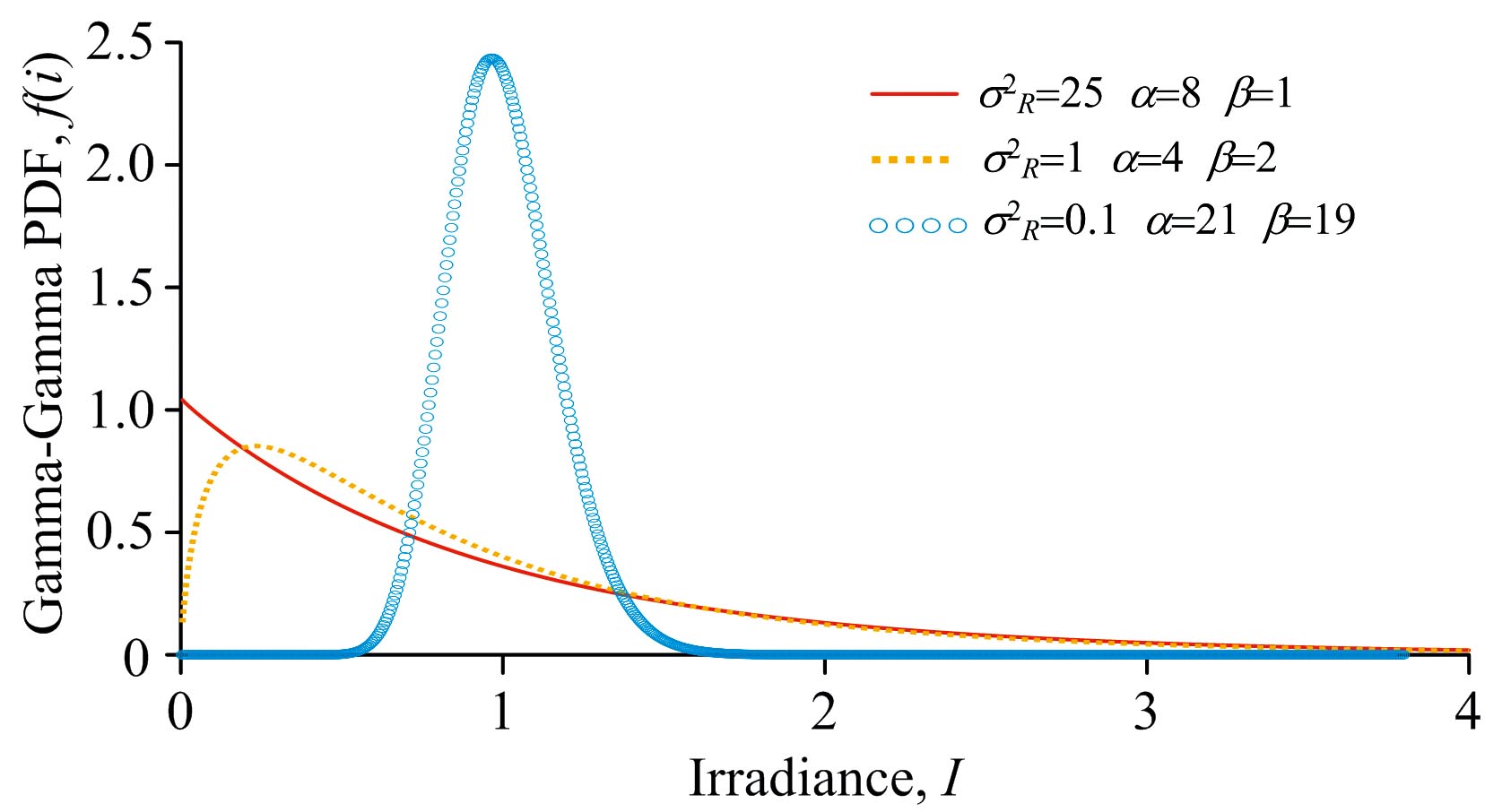 激光在大气中的传播过程较为复杂, 通常使用光强起伏的概率密度函数对其进行描述。 Andrews等[12]推导出了Gamma-Gamma模型并对其进行完善, 在弱到中等再到强湍流的环境下该分布模型均有很好的适用效果