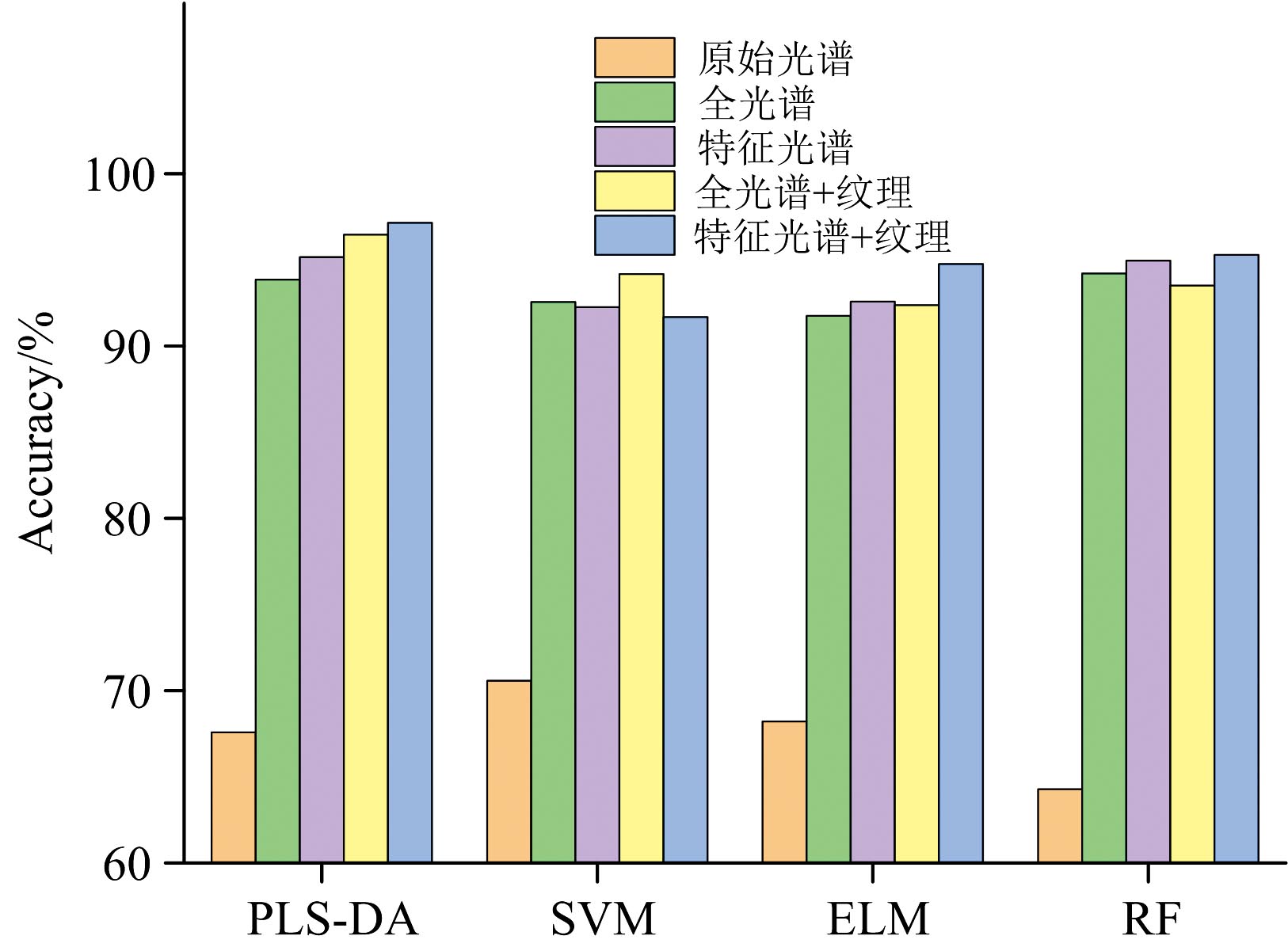 将高粱的高光谱谱线数据和提取的图像纹理特征数据采用低层数据融合方法进行光谱-图像数据融合[13], 光谱-图像数据融合方法如图7所示。 经PLS-DA算法模型获得的高粱品种分类识别结果如表1所示。 高光谱数据与图像纹理特征数据融合后, 基于PLS-DA模型下全光谱和特征谱段条件下的高粱品种分类识别精度分别提升到96.47%和97.16%, 相比于单一的高光谱数据更适用于高粱品种分类识别, 光谱-图像数据融合既考虑了高粱籽粒内部的化学成分信息, 又考虑了高粱籽粒的外部形貌信息, 从而光谱-图像数据融合能够有效地提高了高粱品种的分类识别精度。 为确保光谱-图像数据融合用于高粱品种的分类识别结果的有效性, 分别采用SVM、 ELM和RF三种分类机器学习算法模型对高粱品种进行分类识别, 结果如图8所示。 采用原始高光谱数据对高粱品种的识别精度均在70%附近, 识别效果不佳。 经MSC对高粱高光谱预处理后, 高粱品种的识别精度均高达90%以上, 高光谱的MSC预处理对高粱品种的识别精度均提高了30%以上, 并且经SPA降维后的选取的特征谱段用于高粱品种识别的识别精度优于全光谱情形, 而且光谱-图像数据融合的高粱品种识别精度优于高光谱数据。 相比于SVM、 ELM和RF三种分类机器学习算法模型结果, PLS-DA机器学习算法模型的高粱品种分类识别精度最好。 综上所述, 基于高光谱技术结合机器学习算法对高粱品种进行鉴别是可行的, 并且光谱-图像数据融合能够进一步提高高粱品种识别精度。