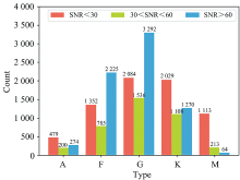 实验中使用的数据是来自LAMOST的恒星二维光谱。 第一部分的实验数据集共包括953个A型恒星, 4 362个F型恒星, 6 912个G型恒星, 4 407个K型恒星, 1 390个M型恒星。 第二部分实验中, 统计目前已有单根二维光谱数据分布在不同信噪比区间的恒星数量如图6所示, 可以看到M型恒星在SNR>60的区间只有64个样本, 与其他类型的恒星数量相差悬殊, 为充分利用已有的二维光谱, 因此第二部分实验仅对A、 F、 G、 K四类恒星进行分类。 信噪比区间分为SNR<30, 30<SNR<60, SNR>60。 在每个信噪比区间内, 选取A型恒星的数据量为200, F型、 G型、 K型恒星的数据量依次为700、 1 500和1 100。 以上恒星均有蓝端和红端光谱图像。 在实验时将数据集按照8∶1∶1的比例分别划分为训练集、 验证集和测试集。