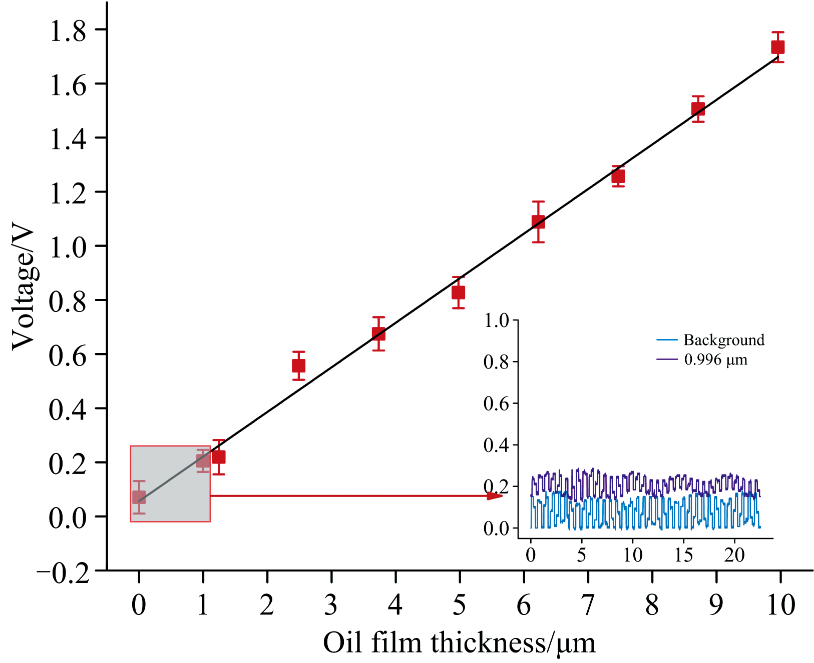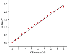 从图9中可以看出, 信号强度随着容积的增加呈线性增长趋势。 利用最小二乘法对数据进行线性拟合, 拟合结果为0.302x+0.028(x为机油容积), 斜率误差为0.001 4, 背景误差为0.000 1, 空白样信号的标准偏差(Sd)测量值为0.019 V, 得到检出限约为0.189 μ L。