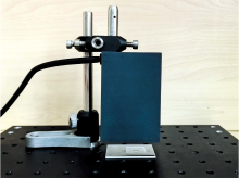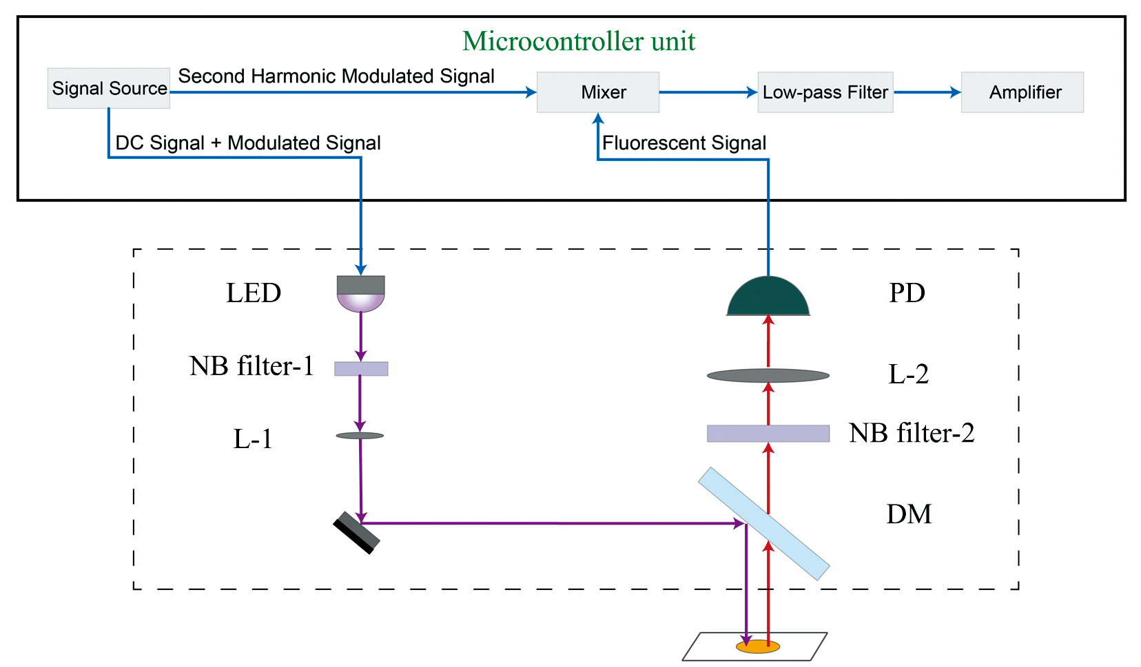 图2实线部分为数据控制流程图。 系统选用了STM32F405RGT6微控制器作为主控芯片, 利用其灵活的计算能力和内置的DAC功能实现调制解调技术。 微控制器通过DAC功能产生直流电压信号和正弦波信号, 二者相加后的信号用于驱动LED电流。 探测器采集由LED激发产生的荧光信号后, 输出的电信号经过两级反相放大电路处理后输出到微控制器继续处理, 从而获得足够大的增益。 随后, 为了实现信号的有效解调, 系统采用了二倍频解调技术。 在此过程中, 微控制器通过DAC功能产生调制信号的二倍频信号与荧光信号在混频器中进行乘法运算, 生成的混频信号被送入低通滤波器进行处理。 低通滤波器有效滤除所有与时间相关的高频成分, 只保留与信号解调相关的低频部分。 经过这一处理后, 系统能够获得具有较高信噪比的荧光信号二阶微分, 这即为荧光信号的有效信息。 最后, 经过放大器的进一步放大, 获得最佳解调荧光信号。 整个检测系统的光路部分放置在一个体积为60 mm× 90 mm× 40 mm的模具, 实物图片如图3所示。