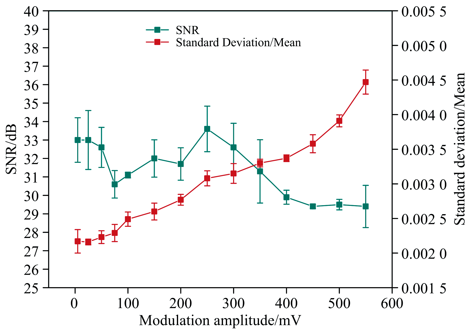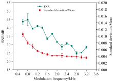 调制幅度不影响系统响应时间, 图5显示了调制幅度对荧光信号信噪比和激发光源波动程度的影响。 该测试中调制频率为2 kHz, 增益因子为60, 滑动滤波窗口数据量为200。 从图中可以看出, 随着调制幅度增加, 激发光源的光强波动逐渐增大, 这是因为调制幅度增加引起电流变化同步增加, 进而传导到光源波动。 在测量范围内, 发现荧光信号信噪比在5~50 mV及250 mV时, 解调信号的信噪比较大。 综合考虑后选取50mV作为最优调制幅度, 在保证高信噪比的同时减少信号波动。