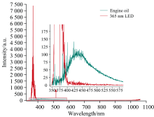设计机油检测装置之前, 需要获得机油荧光光谱数据。 我们采用RealLight公司的RL-SPEC-01型号光纤光谱仪, 采集LED光源的光谱数据以及其激发机油后产生的荧光光谱数据, 如图1所示。 可以清晰地看到, 由365 nm LED光源激发机油后产生的荧光信号的波峰主要集中在410~460 nm的波长范围内。 基于此观察并考虑可获得的商业滤光片选段, 选择420 nm作为荧光信号的检测波长。