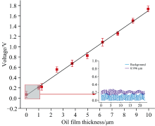 图10展示了荧光信号与油膜厚度的关系。 实验结果表明, 信号强度随着机油油膜厚度的增加呈线性增长趋势。 这一线性关系表明, 系统能够准确地反映油膜厚度的变化, 且具备较高的灵敏度和响应能力。 同样地利用最小二乘法对数据进行线性拟合, 拟合结果为0.165x+0.056(x为机油油膜厚度), 斜率误差为0.004 1, 背景误差为0.024, 空白样信号的标准偏差(Sd)测量值为0.011 V, 得到的检出限约为0.2 μ m。 这一结果验证了在一般自然光环境下, 装置对薄油膜厚度的高精度检测能力。