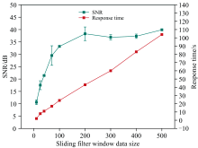 图4显示了滑动滤波窗口数据量对荧光信号信噪比和系统响应时间的影响(不影响激发光源光强的波动程度)。 该测试中调制频率为2 kHz, 调制幅度为400 mV, 增益因子为60。 从图中可以看出, 随着滑动窗口数据量的增加, 响应时间呈现出显著的线性增加关系。 在窗口数据量较少时, 荧光信号的信噪比也呈线性增加趋势, 但当滑动窗口数据量达到200时, 信噪比趋于稳定。 表明在该窗口数据量下, 滤波器已经能够有效平滑信号并降低噪声的影响, 后续选择该数目为最佳滑动滤波窗口数据量。